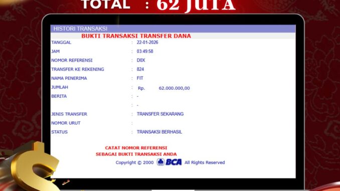 NAGA303 mengucapkan selamat kepada user id : FIT*** yang telah berhasil mendapatkan jackpot pada permainan LIVE CASINO DI OGLOK. Kemenangan sebesar Rp 62.000.000,-. telah dibayarkan LUNAS oleh pihak naga303 kepada pemilik user id setelah yang bersangkutan mengisi formulir withdraw. Proses pencairan dana berlangsung sangat cepat hanya dalam waktu 6-11 menit sudah berada dalam rekening pemilik user id. Bukti transfer yang dapat anda lihat adalah bukti SAH / VALID yang langsung di dapatkan melalui bukti transaksi dari Bank yang digunakan untuk pengiriman dana pada rekening pemilik user id. Terima kasih kami sampaikan kepada para pengguna setia naga303 yang telah menggunakan situs kami, sebagai Bandar Terpercaya yang pastinya membayar semua kemenangan member hingga lunas. Apakah Naga303 PENIPU ? Reputasi “NAGA303 TERPERCAYA” sudah sangat melekat. puluhan hingga ratusan ribu pengguna setia NAGA303 tetap menggunakan situs terbesar dan terbaik di Indonesia ini. Hapus rasa was-was dan khawatir anda, kemenangan anda berapapun PASTI dibayarkan hingga lunas.